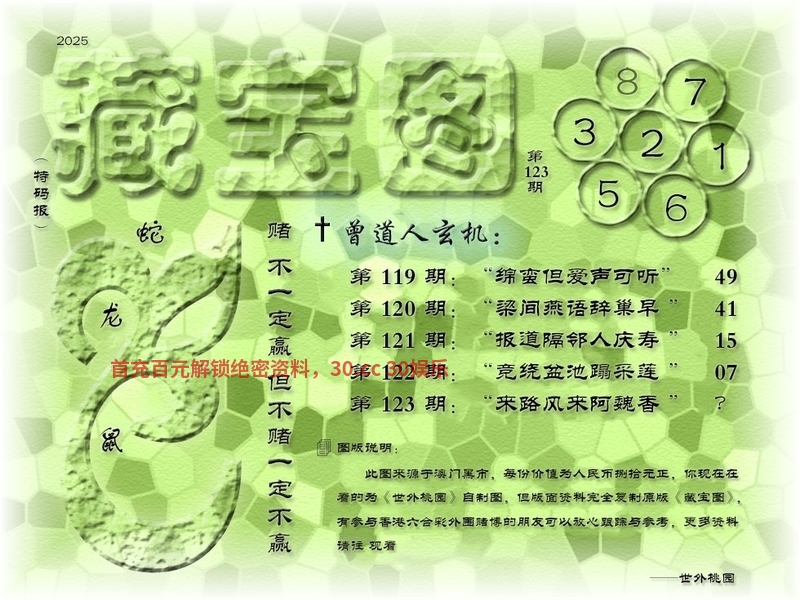 126期藏寶圖新:造化无心本不知 老:流到前溪无半语 禁:兔 禁:8尾 玄機字:《离》